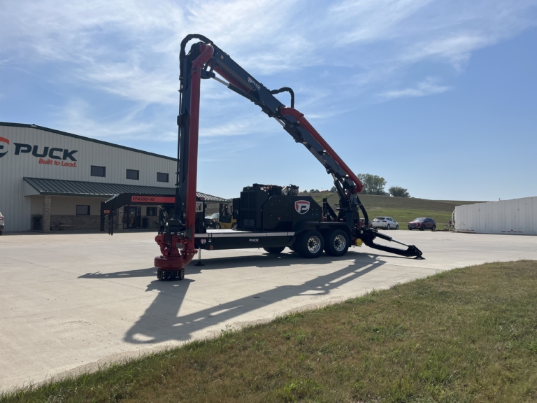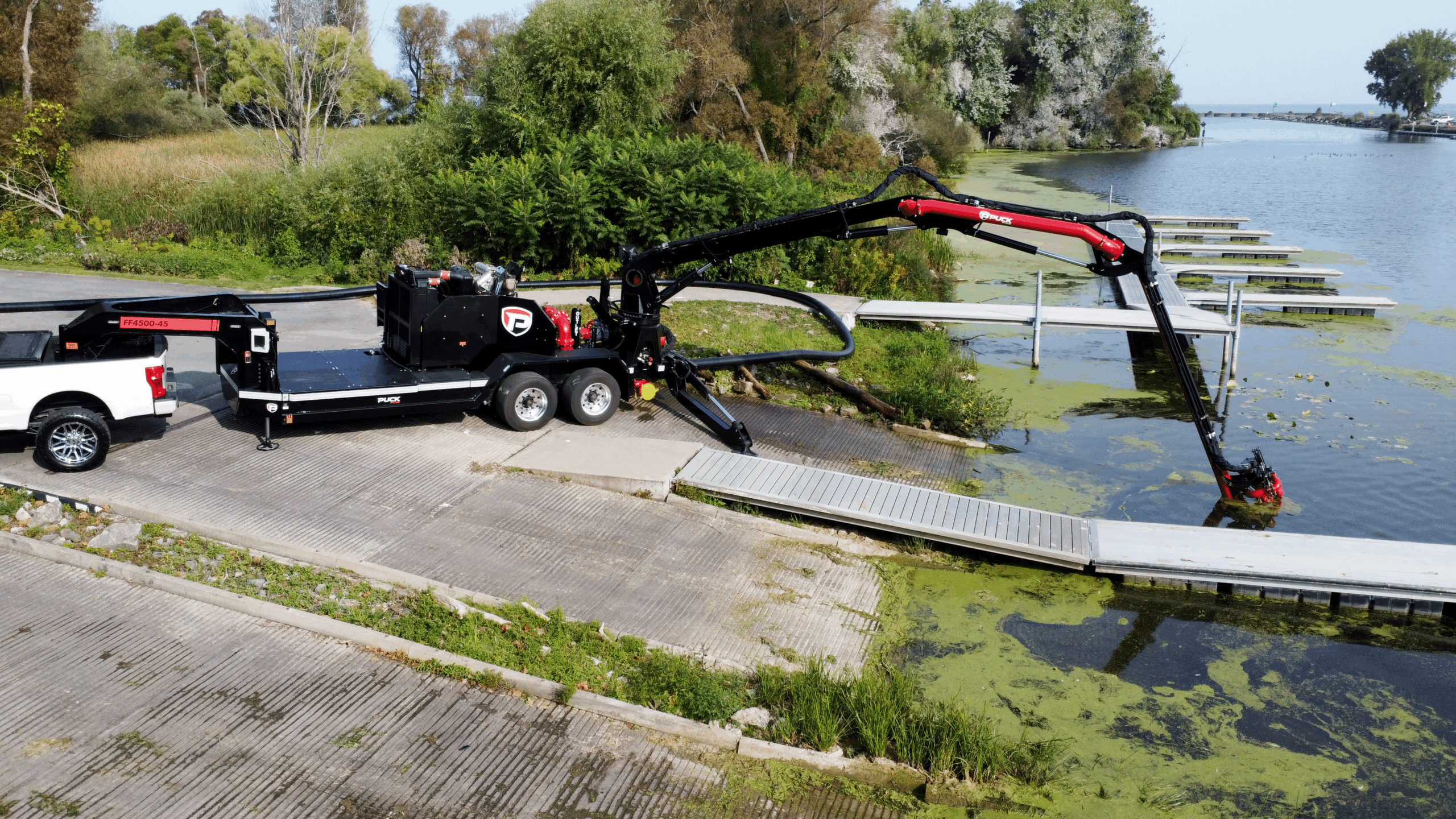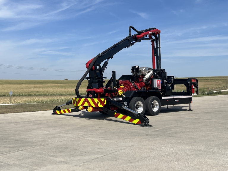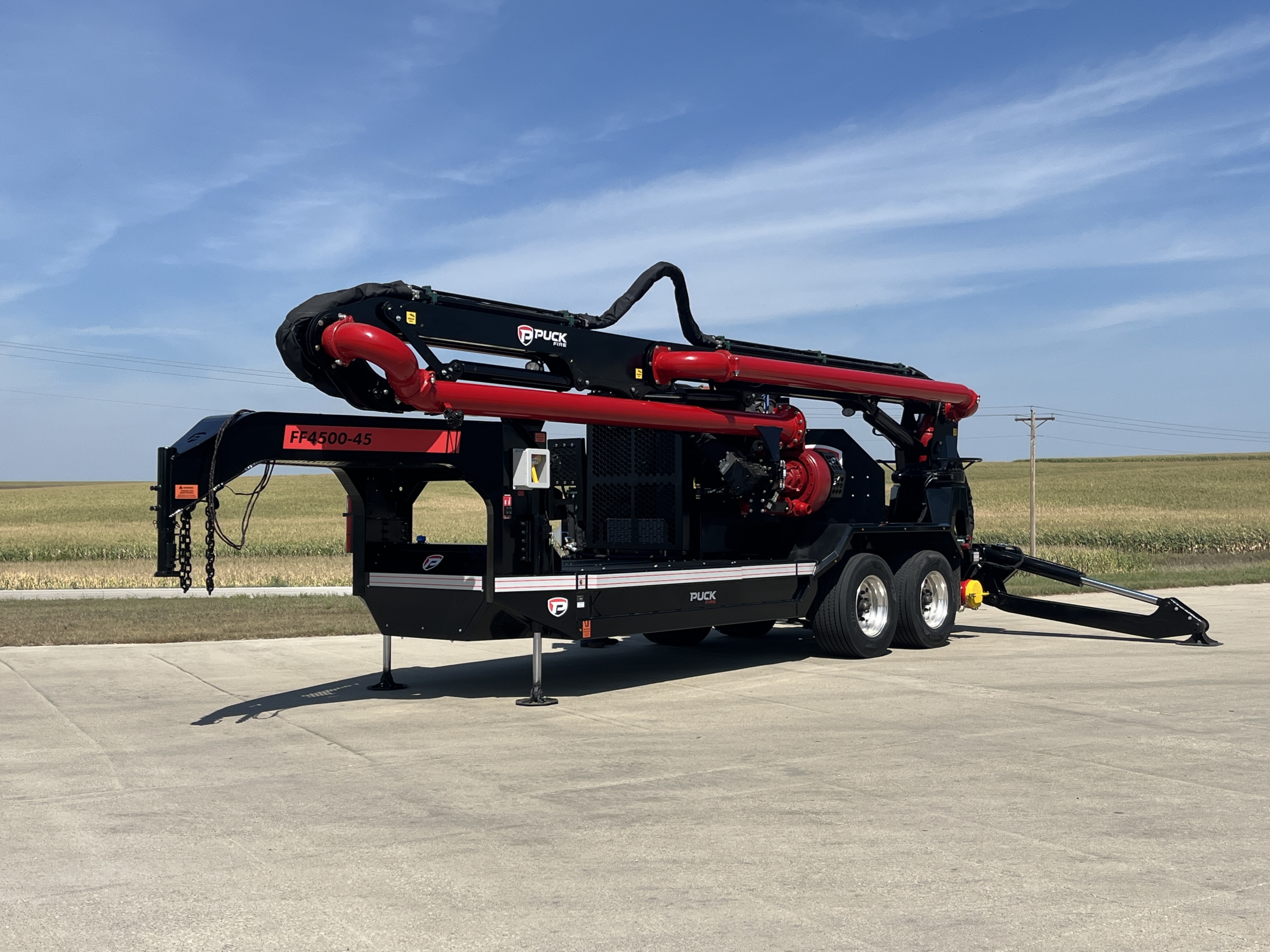 Move water quickly from your liquid storage or water source with the versatile power of the Puck Fire Force Feed Trailer. Built solid with hydrostat controls and designed for ease of deployment, our Force Feed pump brings a higher level of performance for pumping water. The remote control knuckle boom has a horizontal length of 45′ to reach out, down, up and over to get to ponds, lakes, ocean harbors, and more. For quick and easy deployment, the gooseneck chassis of the FF4500-45 can be pulled to the fire with a Puck Quick Attack truck to provide a fast setup water supply solution.