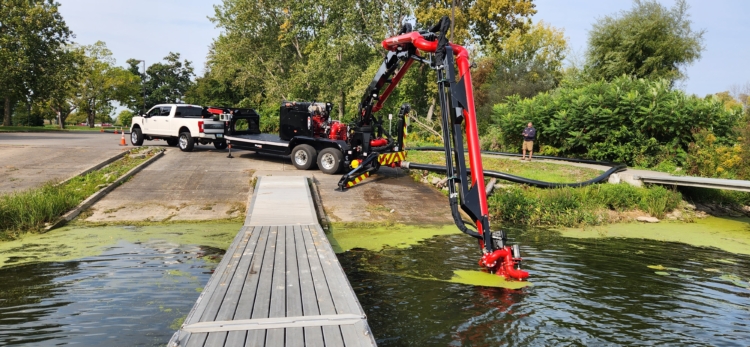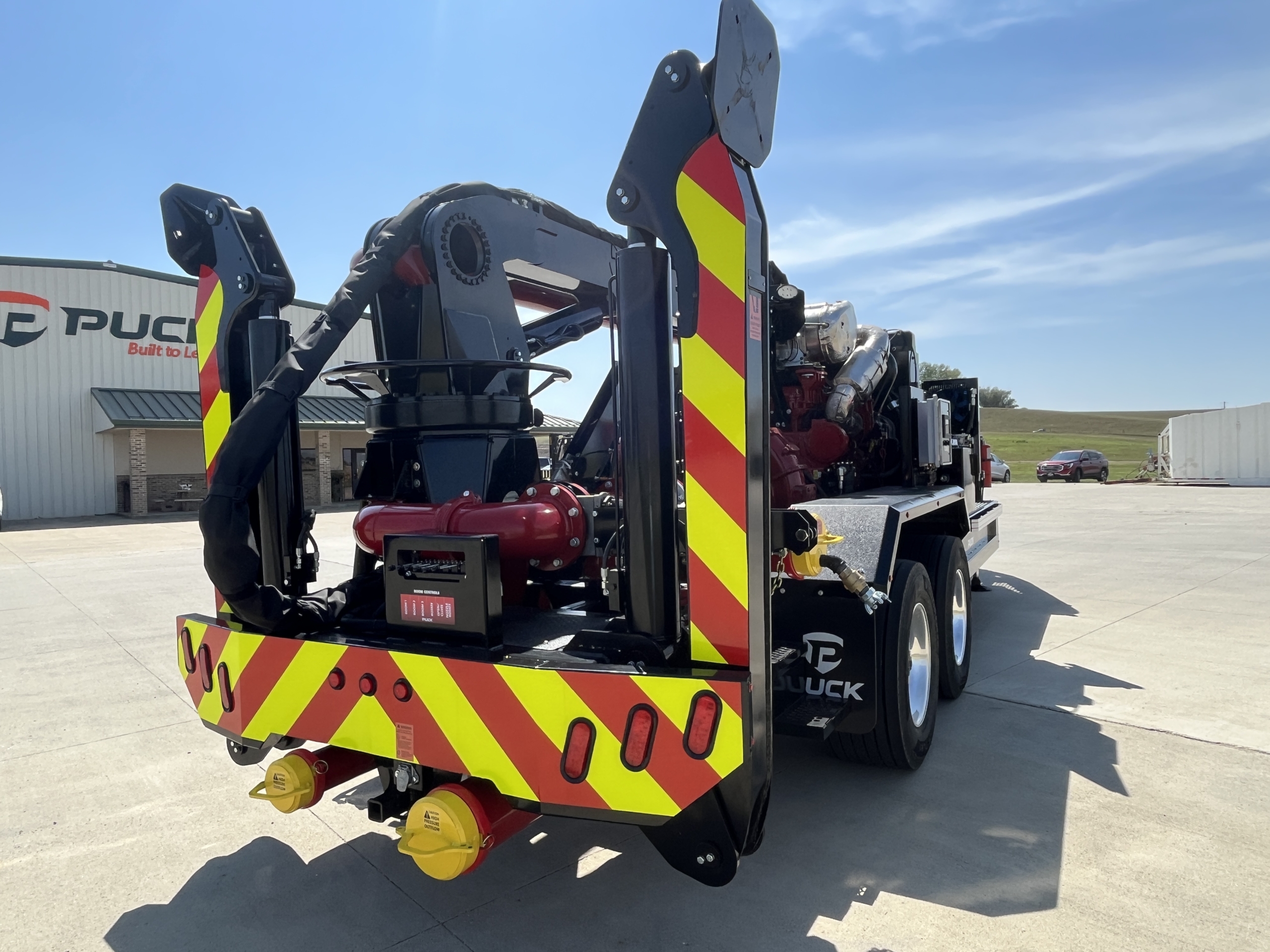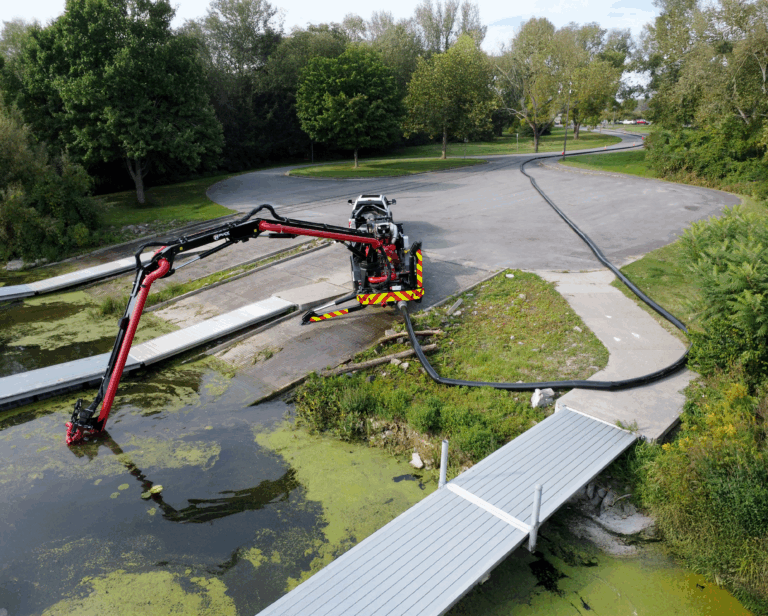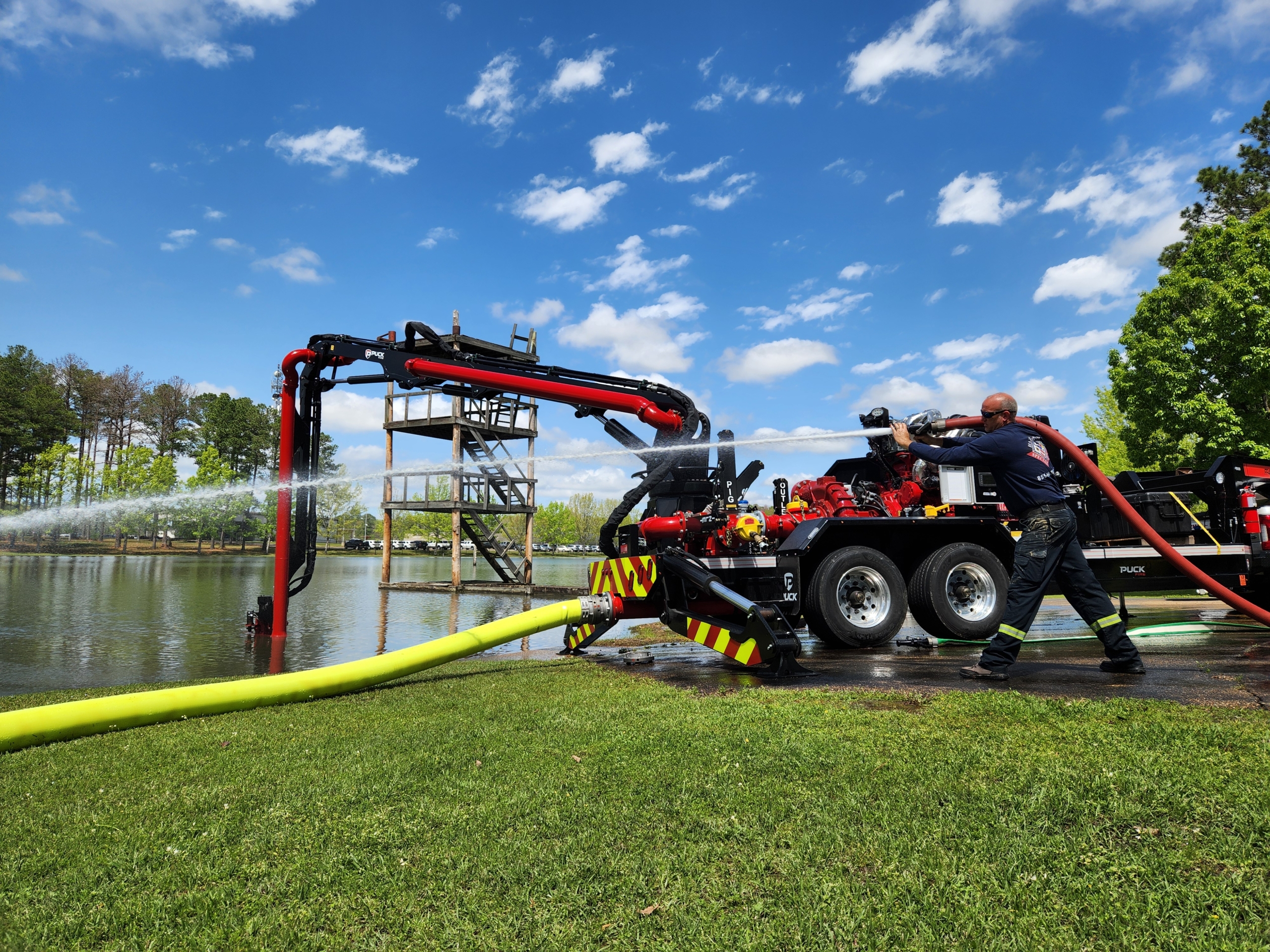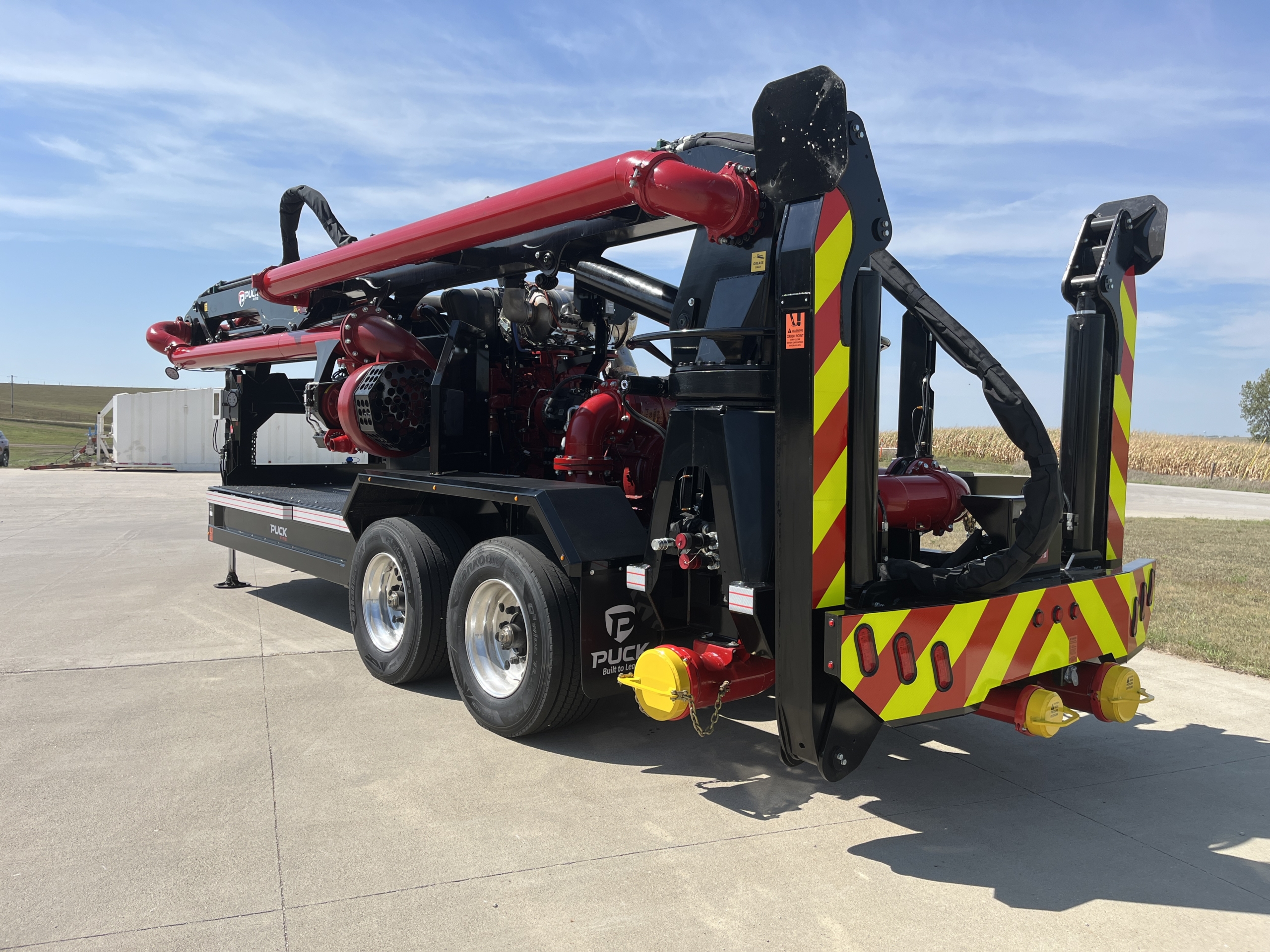 Move water quickly from your liquid storage or water source with the versatile power of the Puck Fire Force Feed Trailer. Built solid with hydrostat controls and designed for ease of deployment, our Force Feed pump brings a higher level of performance for pumping water. The remote control knuckle boom has a horizontal length of 45′ to reach out, down, up and over to get to ponds, lakes, ocean harbors, and more. For quick and easy deployment, the gooseneck chassis of the FF4500-45 can be pulled to the fire with a Puck Quick Attack truck to provide a fast setup water supply solution.