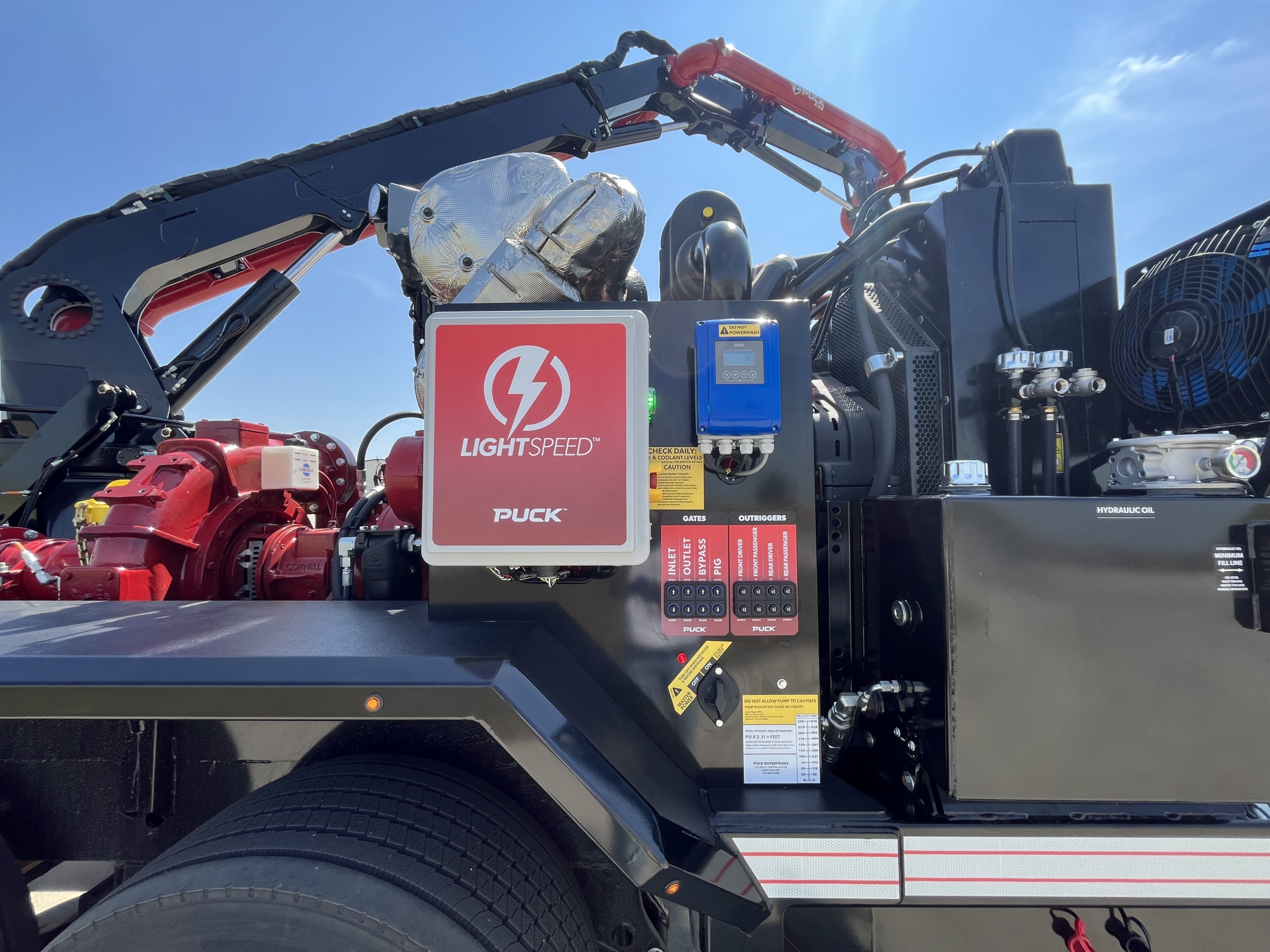 Space on the trailer allows for foam concentrate to be integrated with water at the beginning stages to provide more efficient fire suppression. The 577 HP Cat pump engine is paired with a 8NHG19 Cornell pump with 19″ impeller for maximum displacement. Puck Fire’s FF4500-45 has a 14 hour run time with a diesel fuel capacity of 360 gallons and a DEF capacity of 24 gallons. With 8” pipework and 6”-10” discharge connections, the Force Feed can reach uninterrupted flow rates up to 4,500 GPM.